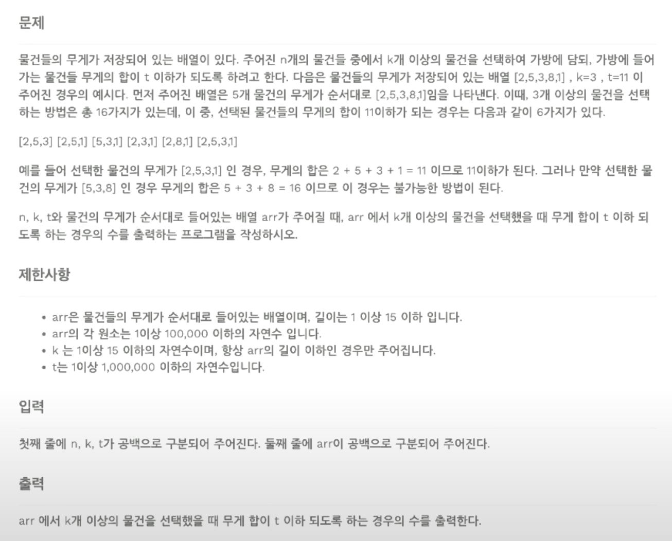 예를 들어, 배열이 [2, 5, 3, 8, 1]이고, 최소 k = 3개의 물건을 선택하면서 그 무게의 합이 t = 11 이하가 되어야 하는 경우.