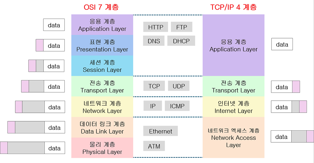 - 응용 계층: 세션 계층, 표현 계층, 응용 계층
